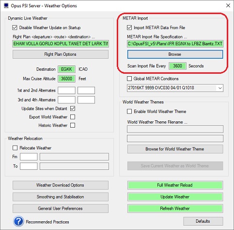 The METAR Import File Specification and file scan frequency (default 3600 secs) is specified within the Weather dialog on the server.